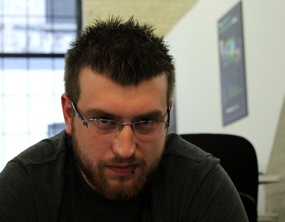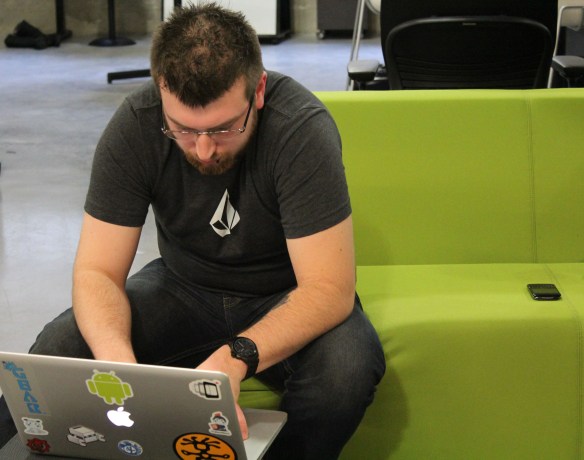 Brent Lintner, 24, takes a short break from building a mobile app for RIM's Blackberry at the Communitech Hub, Kitchener, Ont. on Friday, Jan. 27, 2012. (Andrea Connell/SOMAD News)