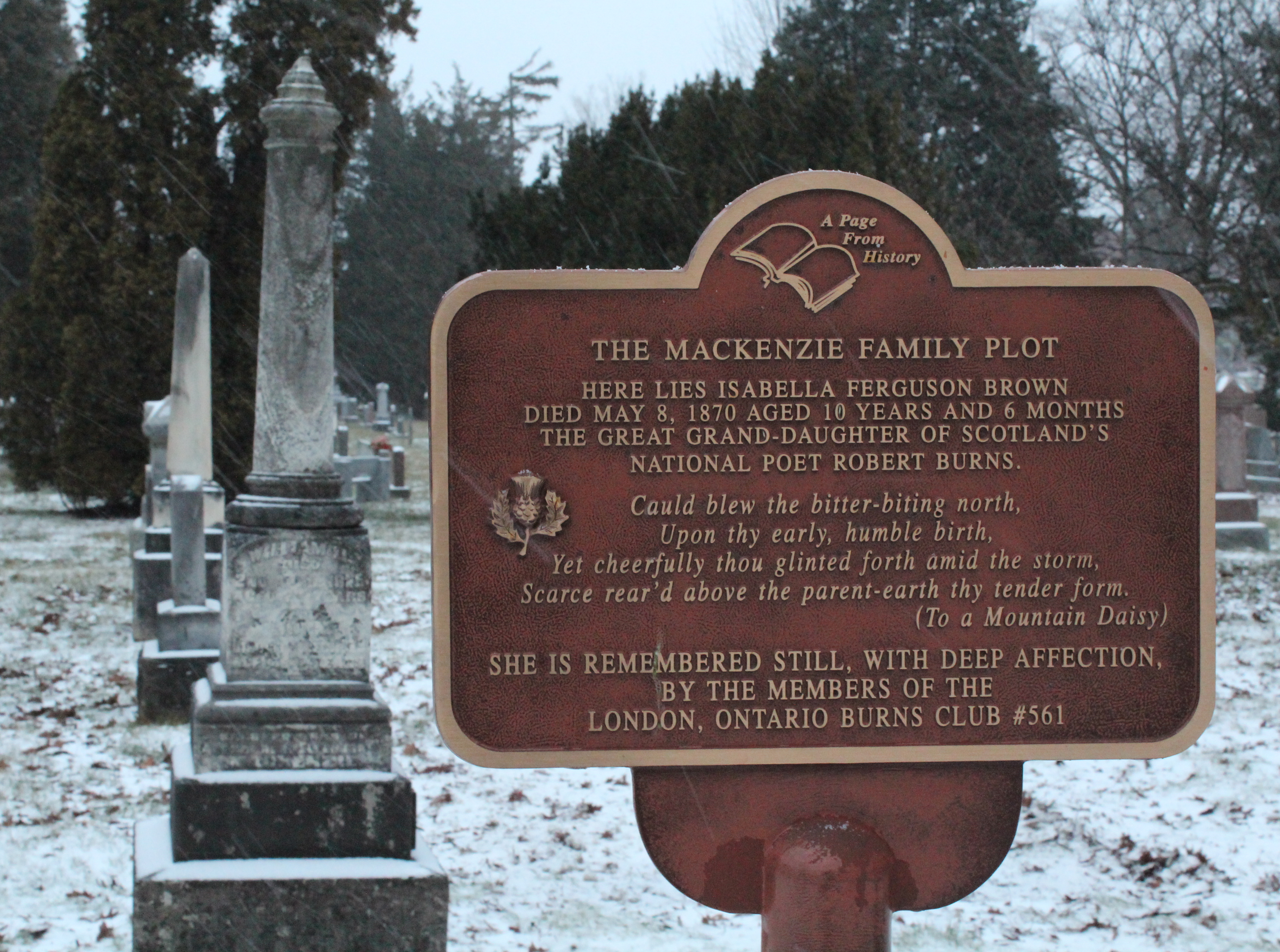 Historic plaque marks the grave site of the great granddaughter of Robbie Burns, Scotland's beloved poet, in the Woodlawn Cemetery, on Woodlawn Rd., Guelph, Ont. (Andrea Connell/SOMAD News)