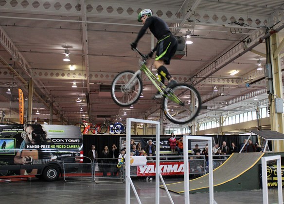 Trevor Bodogh hops over caution tape held two feet off the ground by a couple of young volunteers from the audience at the Toronto International Bike Show on Sun. March 4, 2012.