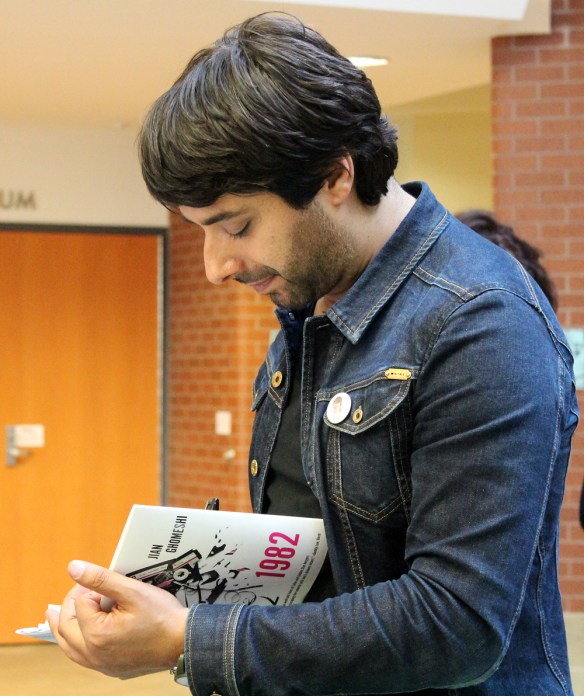 Host of the CBC radio program “Q”, Jian Ghomeshi, signs a copy of his new book 1982, at Rozanski Hall, Universtiy of Guelph on Sat. Sept. 15, 2012. The sold-out event was part of the Eden Mills Writers’ Festival.
