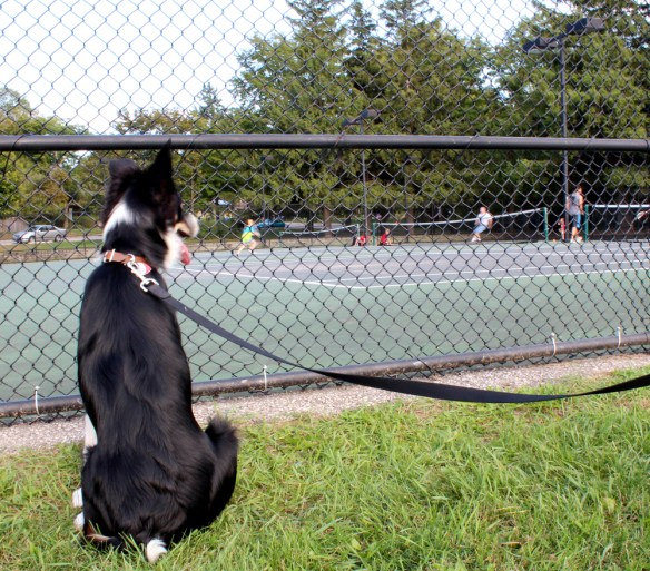 Skye, a six-month-old border collie, takes in a tennis match at Exhibition Park, in Guelph, while his owner waits until he is finished watching. (Andrea Connell)
